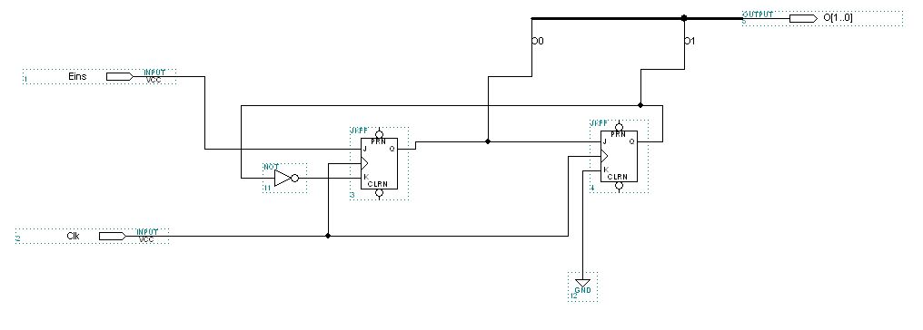 Ja, ich bin weiter. Ich habe ihn vorwärts mit Endzustand 3 hinbekommen. Wenn ich jetzt logisch nachdenke, dann muss ich Q0 und Q1 zum Bus hin nur invertieren, dann habe ich aus 00 01 10 11 11 -> 11 10 01 00 00 gemacht. Mein Programm spinnt da scheinbar aber irgendwie rumm, denn sobald ich Q1 und Q0 zum Bus hin invertiere, dann spuckt er als Ausgang nur noch 00 aus, was ja definitiv nicht sein kann!