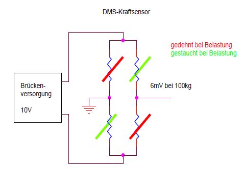 Das sind DMS-Sensoren in Brückenschaltung. Wir haben sowas mal in einem Uni-Projekt verbastelt. Schau mal hier: http://www.emsp.tu-berlin.de/lehre/mixed-signal-baugruppen/dbtreinf und weiter unten die Projektberichte zum Teilprojekt SERVAL und SUPER-SERVAL. Das war genau so eine DMS-Brücke aus einer Söhnle Waage, einmal verarbeitet mit Röhren-Digitaltechnik und einmal mit nem aktuellen µC. Gruß Fabian
