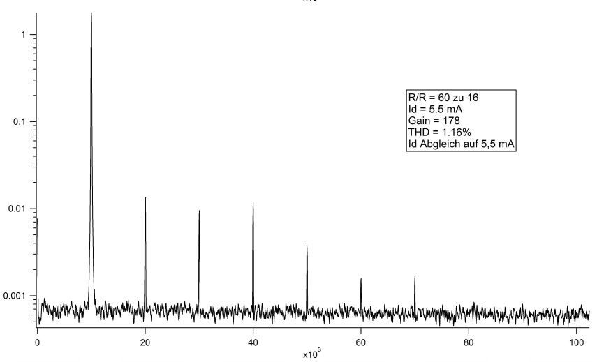 Hallo Leute, Ich bin dabei, für ein Projekt einen ultra low noise amp zu bauen. Dieser sollte deutlich unter den Opamp-Rauschwerten von 1 nV/rtHz liegen. Dabei habe ich schon zahlreiche Paper und Forenbeiträge durchforstet und auch schon mehrere kleine Schaltungen aufgebaut. Ich verwende rauscharme JFET's vom Typ 2SK170, 2SK369 oder IF3601. Diese werden ganz einfach in der Sourceschaltung mit Drain und Source Widerstand verwendet und geben ihre Ausgangsspannung an einen LT1028 OpAmp im nicht-invertierenden Modus als zweite Verstärkerstufe weiter. Bisher konnte ich schon deutlich unter den Referenzwert von 1nV/rtHz gelangen und auch der Frequenzgang und die Bandbreite sind zufriedenstellend. Mein großes Problem nun ist allerdings die Linearität. Der THD bewegt sich meist bei Werten zwischen 0,2 und 3%. Mein Ziel, bzw. benötigen tue ich aber möglichst unter 0,1% Klirrfaktor. In Sachen Arbeitspunkteinstellung der Transistoren habe ich schon viele Werte ausprobiert, allerdings verwende ich meist Werte wie z.b. Uds = 8V , Ugs = -0,12V und Id = 6 mA beim Transistor 2SK170 zum Beispiel. Mit diesen Werten sollte eigentlich ein recht ordentlicher Arbeitspunkt eingestellt sein. Meine prinzipielle Grundschaltung habe ich mal angehängt, die Transistoren habe ich "gematched", also auf gleiche Parameter hin selektiert. Das bringt auch schon etwas in Sachen Linearität, allerdings ist die 2. Harmonische immer noch sehr stark vertreten. Angehängt ist außerdem noch ein Beispielbild meiner Messungen der Harmonischen. Die Versorgungsspannung beträgt 12V und das Eingangssignal 10 mVpeak bei 10kHz. Ich hoffe, dass mir jemand weiterhelfen kann, zum Beispiel über welche Tricks man die Linearität noch weiter verbessern könnte, möglichst natürlich mit der verwendeten Schaltung. Vielleicht ist ja auch mit der verwendeten Schaltung nicht mehr rausholbar?! Dagegen spricht allerdings, dass in einigen Papern mit derselben Schaltung Werte von 0,02% erreicht wurden. Schon mal vielen Dank für Antworten, Grüße Tobi