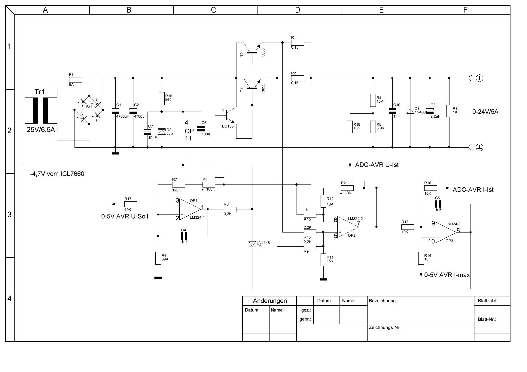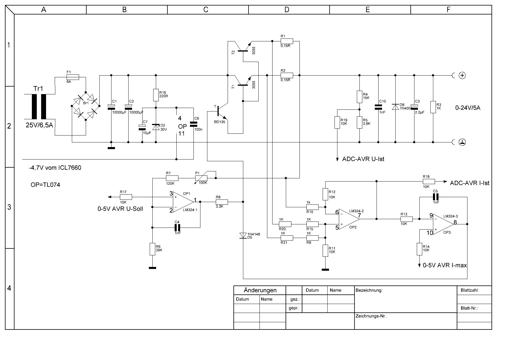 > Was glaubst du, könnte ich da max. rausholen ? Realistisch nicht mehr als 20V/4A bei Netzunterspannung, oder eben meine korrigierten Bauteilwerte nehmen. > Ist mein erstes Netzteilprojekt, bin für hilfe dankbar ........ Die -5V aus ICL7660 sind nicht notwendig, da du OpAmps hast, die mit Signalen im Massebereich klarkommen. Du wirst Schwierigkeiten mit der Stabilität der Regelschleifen haben.