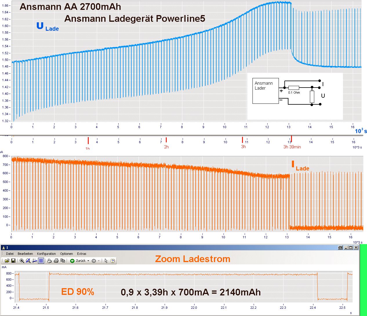 das Ansmann Powerline5 benutze ich zwar schon länger, aber erst seit ich ein paar NiMH Akkus mal per Konstantstrom über Zeit geladen habe, ist mir aufgefallen, dass meine Akkus vorher sehr schnell leer wurden und teilweise in der Digicam gar nicht funktionierten. Daher habe ich mal einen Ladevorgang aufgezeichnet. Ich bin kein Akku-Experte und würde meinen, das Ladegerät arbeitet richtig, wenn man die Ladespannung anschaut. Aber wenn man von Ladekap. = 1,3 x Akkukap. ausgeht, dann fehlt doch da einiges und wie gesagt, funktioniert haben die Akkus (AAA 700mAh für mp3 player und diverse AA für Digicam) auch nie richtig. Ein Nachladen brachte nochmal ca. 100mAh, aber das haut ja immer noch net hin... Aufzeichnung: Akku: Ansmann AA 2700mAh Lader: Ansmann Powerline 5 Ladekapazität ca. 2140mAh (3,39h x ca 700mA x 90% ED) 90% ED: Die Ladung wurde getaktet, 900ms Laden, 100ms Pause... hat jemand 'ne Erklärung??