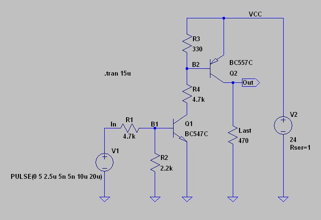 Also.... ...die geposteten Schaltungen sind ja alle recht nett, aber: Marco wollte eine Schaltung, mit der er bis zu 50kHz schalten kann. Also sollte am Ausgang die Flankensteilheit auch dementsprechend sein. Bei den hier gezeigten Schaltungen kommt bei 50kHz mehr oder weniger nur noch Matsch raus... Als Alternative habe ich meinen Vorschlag angehängt. Diese Schaltung braucht auch nur 4 Widerstände und 2 Feld- Wald- Wiesen-Transistoren, schaltet aber deutlich schneller. Die Eckdaten sind bei 470 Ohm Last (entspricht ca. 51mA): Ausgangspannung: 23.8 Volt Stromaufnahme Eingang: 0.9 mA Stromaufnahme kompletter Schalter: 5.8 mA Flankenanstiegs- und Flankenfabfallszeit: 70 Nanosekunden Einschaltverzögerung: 35 Nanosekunden Komplette Einschaltzeit also 105 Nanosekunden Auschaltverzögerung: 90 Nanosekunden Komplette Ausschaltzeit also 160 Nanosekunden Wer es noch schneller möchte, muss andere Transitoren verwenden, oder niederohmiger, oder eine andere Schaltung mit mehr Transistoren... Wem der Stromverbrauch des Schalters zu hoch ist, kann auf Kosten der Ausgangsspannung R3 und R4 anpassen und einen anderen PNP-Transistor verwenden. Denkbar wäre z.B. BC638 oder ähnlich.