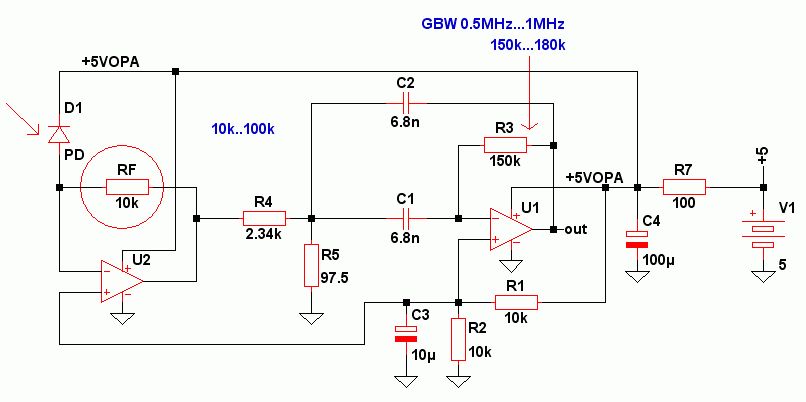Wenn da direkte Sonneninstrahlung möglich ist, dann muss da natürlich konstruktiv etwas dagegen getan werden, z. B. die Photodiode an das Ende eines kurzen Rohres setzen. Das Rohr muss natürlich waagrecht montiert sein, damit die Sonne nicht direkt einstrahlen kann. Ansonsten bleibt noch die Möglichkeit den Widerstand RF durch eine 1H Spule zu ersetzen.