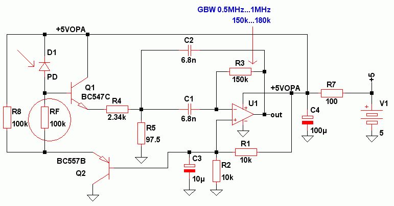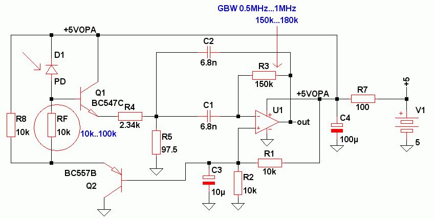 >Hoffentlch musst du dann den Widerstandswert nicht zu stark reduzieren >wegen Fremdlichtübersteuerung. Mit der SFH203 dürfte der Widerstand in der Gegenkopplung des Transimpedanzverstärkers bei 100000lux und 80nA/lux unter 1k liegen müssen, wenn die Photodiode direktes Sonnenlicht abbekommt. Kai Klaas