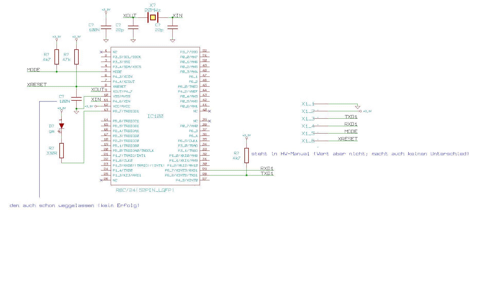 Hallo, ich probiere jetzt schon einige Zeit herum, aber ich bekomme das Teil einfach nicht zum Laufen. Es kommt beim Aktivieren des KD30 Debuggers mit der seriellen Schnittstelle: "Communication ERROR. Can't accept data. ERROR(16014)" Leider ist die Dokumentation bei Renesas sehr unübersichtlich und ich weiß nicht wie ich es besser eingrenzen kann. Ich habe vorher mit dem R8C/13 gearbeitet und wollte jetzt auf ein Derivat mit größerem Speicher umsteigen. Der R8C/13 lauft auch noch, das habe ich gerade nochmal probiert. Der R8C/24 (genauer ein R5F21248SN FP) ist in seiner Minimalbeschaltung an eine kleine Platine mit einem RS232 Tranceiver, einem Jumper für Mode und einem Resettaster an den PC angeschlossen. Das Teil verwende ich auch schon für den R8C/13. Das geht also. Auf der Targetplatine ist ein Quarz mit 20MHz und die beiden 22pF Kondis gegen Masse. Ein 4k7 Pullup an Mode, VSS und VCC sind verdrahtet. Dann ist nur noch der TXD1 und RXD1 mit der besagten Platine verbunden. Im HW-Manual stand bei den Beispielschaltungen für Debugging was von einem Pullup an TXD1, was ich zwar nicht ganz verstanden habe, da das ein Ausgang ist, aber auch das hat nicht geholfen. Im Anhang ist meine Schaltung nochmal als pdf. Ich verwende 3,3V als Spannungsversorgung aus einem Konstanter. Da der R8C/13 seine Problemchen mit 3,3V hatte, habe ich auch mit den 47k Pullup und dem 100NF Kondensator probiert. Auch das Probieren mit verschiedenen mcu-Files hat keinen Erfolg gebracht. Im Anhang ist der Schaltplan. Hat jemand von Euch einen Tipp wo bzw. nach was ich noch suchen könnte? Das wäre echt nett. Grüße Uwe