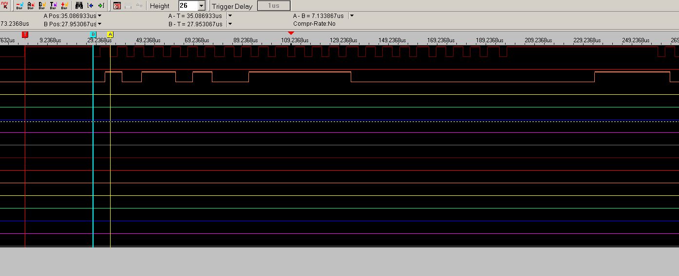 Ich hab mal einen Auschnitt vergrössert darstellen lassen. Man sieht schön das ein Bit immer nach der Fallenden Flanke kommt. In dem Fall wäre es Binär 111010. Meine Graphik deckt sich mit denen von Einhart Pape. Nun die erste Steigende Flanke ist ca. 51 us sekunden Lang dan kommen die Takte in Abständen von genau 24 x 17 us dann kommt eine High Flanke von 110 us nun folgen die letzten 24 Bit. Gerry
