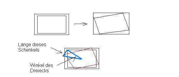 Wie lauten die Formeln, die die neue Position eines Punktes angeben, wenn dieser um einen Winkel Alpha um einen Drehpunkt gedreht wird? (Den Drehpunkt nimmst du sinnigerweise im Ursprung des Koordinatensystems an. D.h. deine Rechtecke sind rund um den Ursprung zentriert) Die Fragestellung lautet dann: Nehmen wir den Punkt links oben. Wie weit muss man ihn drehen, damit seine X-Koordinate einen ganz bestimmten Wert (nämlich den der linken Kante des äusseren Rechtecks) annimmt.