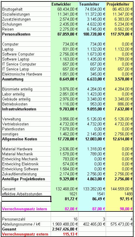 Naja, da wurden auch Äpfel mit Birnen verglichen. Sicherlich soll diese Tabelle Auskunft über die Personalkosten geben. Was haben dann beim Entwickler Posten wie Material Entwicklung, Material Mechanik, Entwicklung Elektronik, Entwicklung Mechanik, Entwicklung Software und Zukauf externen Dienstleistungen bei der Abrechnung der Personalkosten zu suchen?