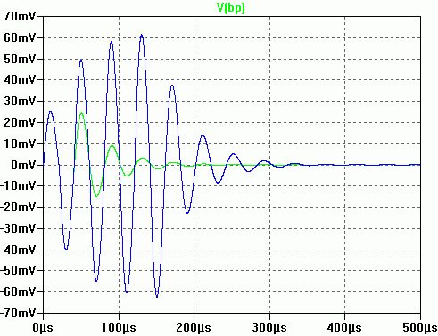 @Peter, die Lösung mit dem Bandpass geht, wenn du zwar mit 25kHz modulierst (Rechteck 50%), aber nur max 4kBit/s Nutzdatenrate haben willst, weil der Bandpass ein Ein- und Ausschwingen bewirkt. Im Bild siehst du das Signal nach dem Bandpass. Grün: 1 Puls, 20us Dauer Blau: Pulspaket mit 4 Pulsen a' 20us Dauer und 40us Periodendauer
