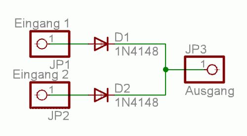dienstag schrieb: > Hallo oszi40 , > > Ich habe an sowas gedacht 2x 7805 daraus werden 2x5V Signale > gewonnen, die an einem OR-Gatter angesclossen sind. > > > Wäre sowas in Ordnung? Nein, natürlich nicht in Ordnung. Du sollst die beiden Spannungen über die 2 Dioden zusammenführen, diese bilden das Oder Gatter.