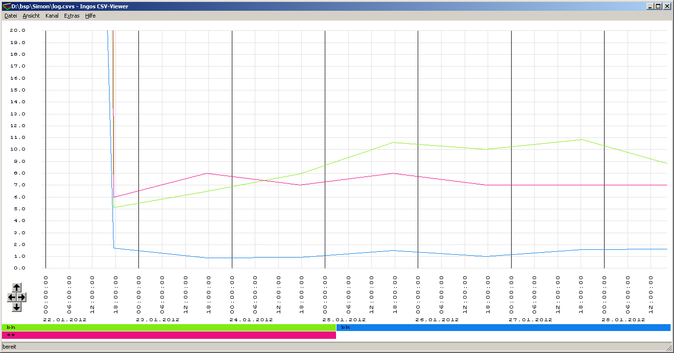 Hallo Ingo, hab da in der neusten Version (11.01.2013) doch noch etwas komisches festgestellt beim zoomen der horizontalen Achse. Vertikales zoomen funktioniert. Wenn ich die Daten mit der CSV Viewer Version vom 23.10.2012 (17:16Uhr) öffne, scheint alles wunderbar zu sein. Alle Daten werden dargestellt (Sprung auf Kanal 4 bei 25min und 27min - insgesamt von Zeitstempel 10min bis ca 29min sind Daten vorhanden). Öffne ich nun die gleichen Daten mit der Version vom 11.01.2013 (22:40Uhr) werden nicht mehr alle Daten dargestellt, auch nicht wenn man "ganze Datei" anklickt. Es werden nur wenige Sekunden am Anfang dargestellt. Mit der rechten Cursortaste springt er nur bis an Ende der Daten und stellt nichts mehr da. Mit der linken Cursortaste springt er dann wieder an den Anfang. Auch das horizontale zoomen mit der linken Maustaste scheint nicht wie gewünscht zu funktionieren. Eventuell ist auch meine Datendatei falsch aufgebaut. Gruß Markus
