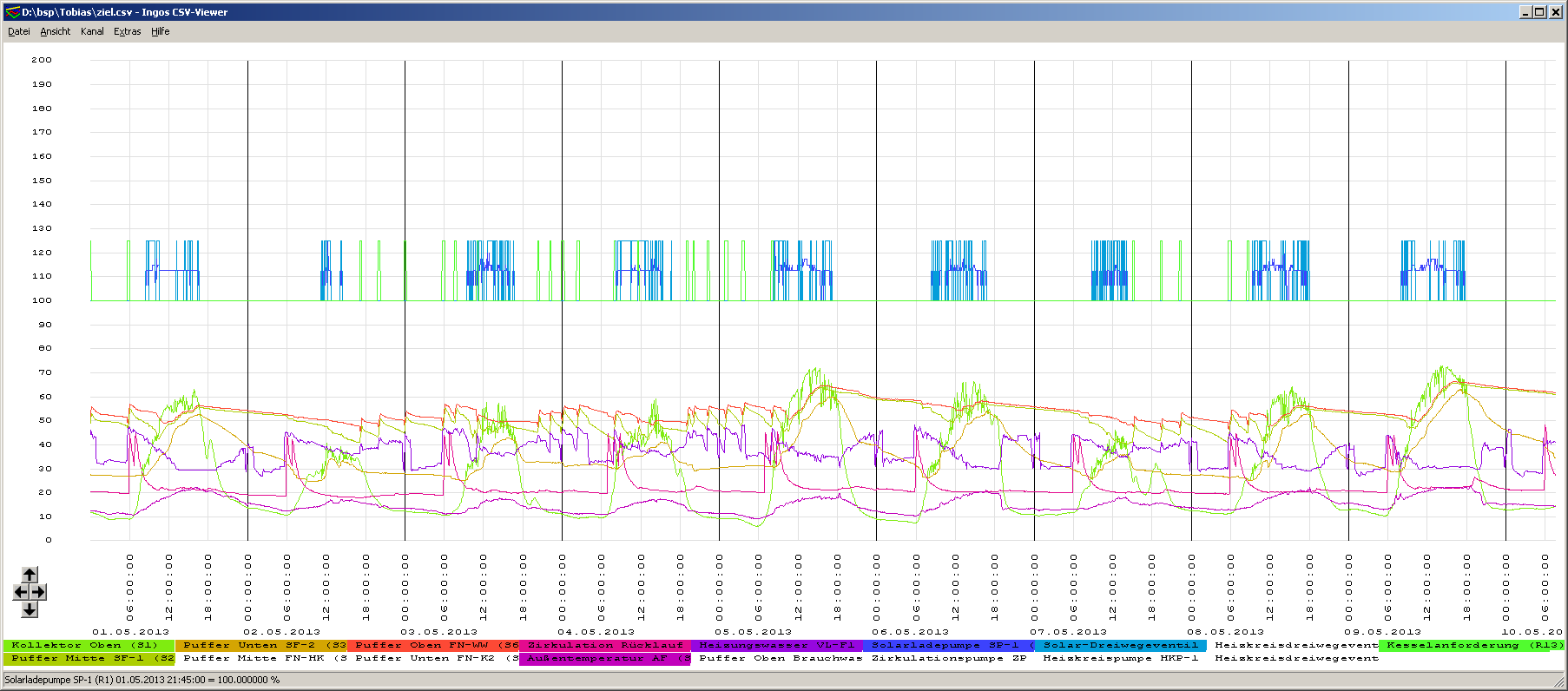 Ich komme aus Holland und suche einen CSV Visualisierung von geloggten Daten von einem Citrin-Solar Regler 2.5. Ich habe einem datei mit geschikt. Koent Ihr mir dabei helfen? Herzlichem Dank! Datei" in Excel eingelesen: Datum & Uhrzeit Temperatur Sensor 1 [ °C] Temperatur Sensor 2 [ °C] Temperatur Sensor 3 [ °C] Temperatur Sensor 4 [ °C] Temperatur Sensor 5 [ °C] Temperatur Sensor 6 [ °C] Druck Sensor 7 [ Bar] Temperatur Sensor 8 [ °C] Durchfluss Sensor 9 [ l/h] Durchfluss V40 [ l/h] Einheit PWM 1 [ %] PWM 2 [ %] Drehzahl Relais 1 [ %] Drehzahl Relais 2 [ %] Drehzahl Relais 3 [ %] Drehzahl Relais 4 [ %] Betriebssekunden Relais 1 [ s] Betriebssekunden Relais 2 [ s] Betriebssekunden Relais 3 [ s] Betriebssekunden Relais 4 [ s] Fehlermaske Statusmaske Wärme [ Wh] Version Systemzeit Systemdatum "28.04.2014 16:47 41,6 34,4 39,8 22,9 888,8 -88,8 -999,9 -88,8 -9999 0 11 0 0 0 100 0 0 107427 1358798 0 0 0 0 0 1,01 16:47 20140428 " "28.04.2014 16:48 48,5 34,3 39,8 22,8 888,8 -88,8 -999,9 -88,8 -9999 0 11 0 0 80 100 0 0 107462 1358858 0 0 0 0 0 1,01 16:48 20140428 " "28.04.2014 16:49 52,7 34,4 39,8 22,8 888,8 -88,8 -999,9 -88,8 -9999 0 11 0 0 100 100 0 0 107522 1358918 0 0 0 0 0 1,01 16:49 20140428 " "28.04.2014 16:50 48,2 34,6 39,8 22,8 888,8 -88,8 -999,9 -88,8 -9999 0 11 0 0 80 100 0 0 107582 1358978 0 0 0 0 0 1,01 16:50 20140428 " "28.04.2014 16:51 43,7 34,8 39,8 22,8 888,8 -88,8 -999,9 -88,8 -9999 0 11 0 0 50 100 0 0 107642 1359038 0 0 0 0 0 1,01 16:51 20140428 " "28.04.2014 16:52 42,1 34,9 39,8 22,7 888,8 -88,8 -999,9 -88,8 -9999 0 11 0 0 50 100 0 0 107702 1359098 0 0 0 0 0 1,01 16:52 20140428 " "28.04.2014 16:53 42,1 35,0 39,9 22,7 888,8 -88,8 -999,9 -88,8 -9999 0 11 0 0 50 100 0 0 107762 1359158 0 0 0 0 0 1,01 16:53 20140428 "