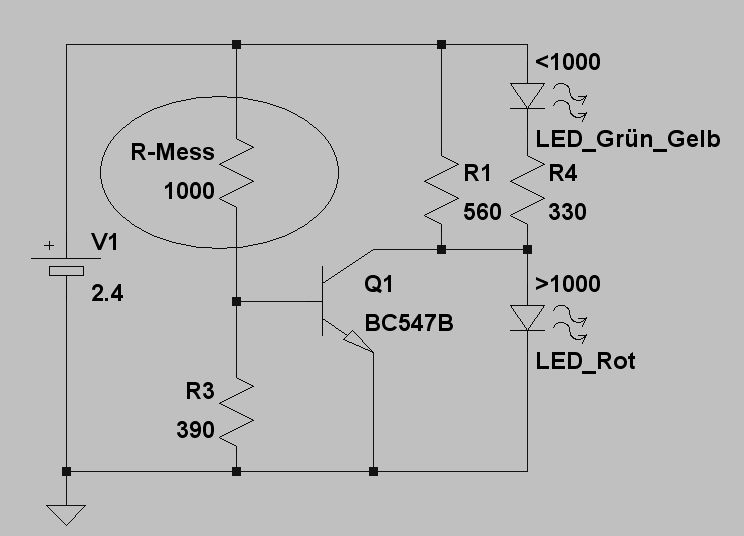 Nabend, so funktioniert die Schaltung, ist aber alles andere als genau. Ist der zu messende Widerstand größer als 1K ist der Transistor gesperrt, es fließt ein Strom durch R1 und die rote LED. Der Spannungsabfall über R1 beträgt .7V und lässt kein Stromfluss durch die grüne LED zu. Ist der Widerstand kleiner 1K ist der Transistor leitend, die rote LED wird kurzgeschlossen und über R4 und die grüne LED fließt jetzt ein Strom. Ich glaube das ist die ungenaueste Widerstandsmessschaltung im ganzen bekannten Universum. GN8 Leo