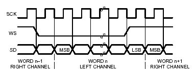 zusatzinfo.: Der Takt und Word Select bei I2S wird vom Master erzeugt. WS - Wordselect - dient dazu um zwischen dem rechten und linken Kanal unterscheiden zu können. WS ändert seinen zustand ein Clockperiode bevor das nächste Word anfängt, damit der Slave Zeit hat das letzte Wort zu speeichern und sich für das nächste vorzubereiten. SDA - Serial Data - Die Daten werden MSB first übertragen, damit auch Geräte mit unterschiedlicher Word- Länge keine Probleme haben. Die fehlenden Bits werden als 0 interpretiert und die Bits die zuviel sind einfach weggelassen. Da es sich hierbei um Audiodaten handelt ist dies möglich, da dadurch nur die Qualität leidet, aber die Grundinformation erhalten bleibt. Die Daten sind mit einer steigenden Flanke gültig.