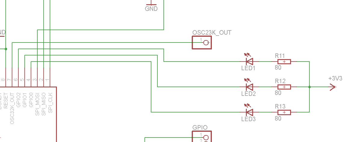 Hallo, ich habe eine Schaltung mit einem ATZB-24-A2 Zigbee-Chip (http://www.atmel.com/dyn/resources/prod_documents/doc8226.pdf) und habe an 3 GPIO LEDs angeschlossen. Bin mir aber nicht sicher ob das so stimmt. Im Handbuch steht das die GPIO stark genug für eine LED sind und dass man auf S. 387 im ATmega1281v Handbuch gucken soll, aber da finde ich nichts über den Anschluss von LEDs. Ansonsten steht da noch: "GPIO Output Voltage (High/Low) -10/5 [mA] 2.3/0.5 [V]" Jetzt wo ich das hier so schreibe, glaub ich ich sollte statt 3,3V GND anschließen und die LEDs umdrehen, oder? Außerdem muss ich die Widerstände dann noch anpassen. 2,3V-2,1V = 0,2V die über dem Widerstand abfallen sollen (Uf = 2,1V) Gruß, Tom