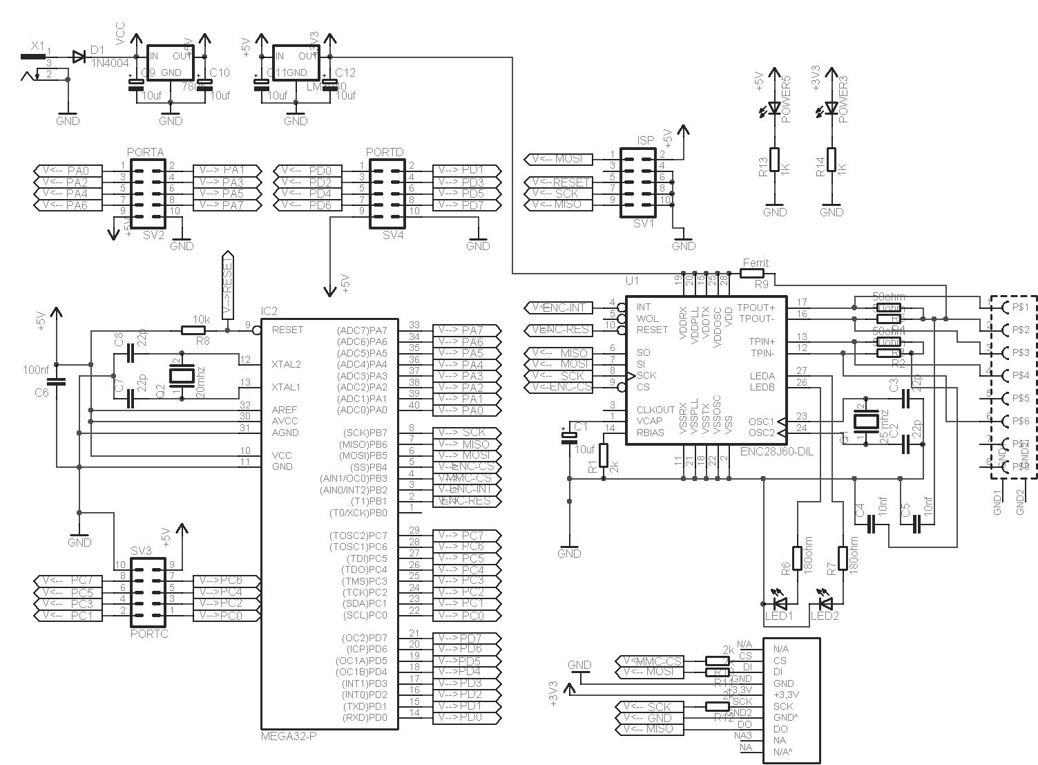 Habe ich heute gemacht alles verglichen und den Pin10 einfach wie bei Pollin mit 3,3 Kohm auf 3,3 Volt gepackt. Leider passiert garnichts. Den AVR kann ich programmieren, stecke ich das Board aber an den Switch leuchtet keiner der beiden Lämpchen. Leuchtet eigentlicht die Linklampe auch ohne AVR, so das ich wenigstens weiß ob der ENC wenigstens geht ? Chris