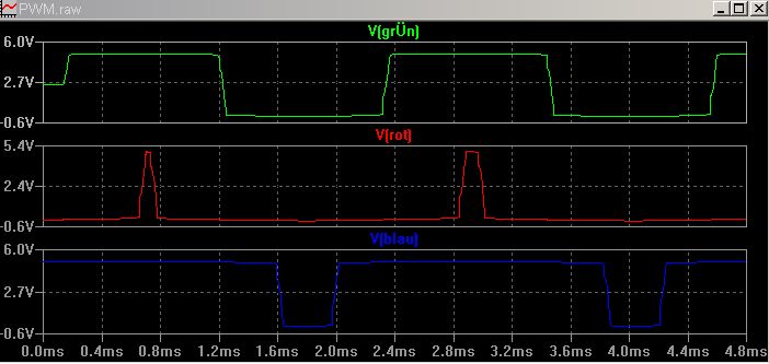 @galilio Wo, in deiner Schaltung ist die RGB-LED? Ich schrieb: >>>Vervollständige doch mal... Was ein Lastenheft ist, weißt du? Darin steht alles was von einer Schaltung erwartet wird(und manchmal auch etwas mehr). Willst du das die drei Farben asynchron angesteuert werden? Dann brauchste drei 555, für jede Farbe einen eben. Wenn es synchron wertdiskret sein soll kannste meinen Vorschlag mit deinem Schaltplan von 18:47 kombinieren in dem du den 555 als Frequenz/PWM-Generator mit den drei Komparatoren (U2,4,6) verbindest und dann kannste noch die Helligkeit einzeln einstellen. Ich glaube nicht das der urschrüngliche Oszillator deinen Vorstellungen nach Einstellmöglichkeiten entspricht. Ohne nähere Angaben über Sinn und Zweck ist das aber nur ein Schuss ins Blaue. Wie das oben schon gepostet wurde muss der LED-Strom mit einem geeigneten Vorwiderstand oder einer Konstantstromquelle begrenzt werden, sonst kann die Led oder die treibende Schaltung Schaden nehmen.