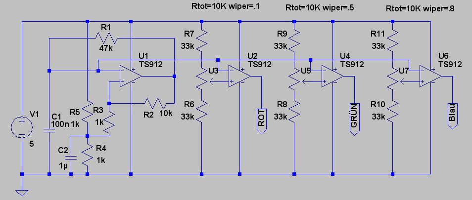 Hallo, 'n Gast (Gast) schreibt : Wären 4 OpAmps da nicht sinniger? 1x Dreieck, 3x Komperator Dreieck zu Poti für R,G und B. ---> was meinst du damit? meist du dass was "Leonardo W." vorgeschlagen hat ? oder was andres ? an der Dateianhang ist sein Vorschlag Viel grüße galilio