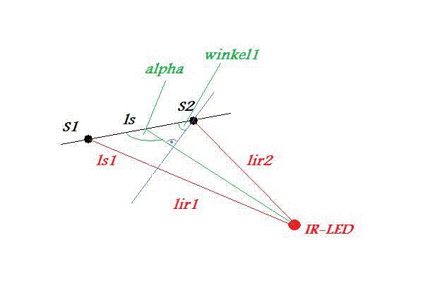 > Kann man mithilfe der beiden Sensoren den Winkel der Geraden auf die > aussendende IR-LED berechnen?? Nein. Geometrie Grundschule. Du weisst weder Winkel noch Entfernungen.