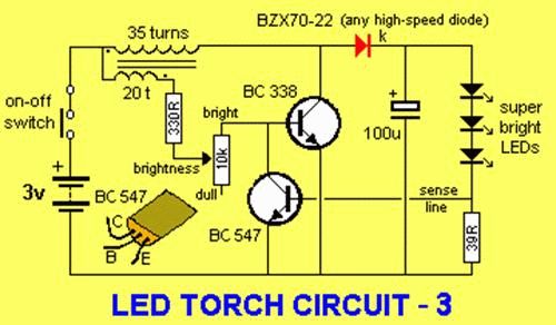 Ist quasi genau das gleiche wie von Elm Chan nur noch mit Strombegrenzung. http://elm-chan.org/works/led1/report_e.html Schalte die zwei Batterien doch parallel oder nimm zwei Akkus. Ist der 39 Ohm Widerstand hinter den LEDs bei dir auch so groß? Es sollten nicht mehr als 15mA fließen und 20mA sind glaub ich das Maximum für "Standard" Ultra helle LEDs.