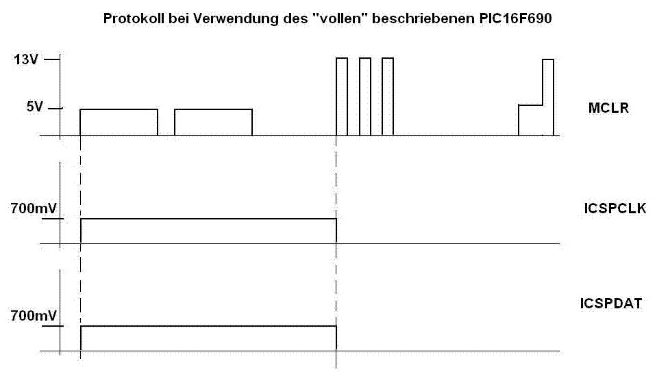 Hallo, ich danke euch für eure hilfe. die Schaltung und HEX file kann ich nicht zur verfügung stellen. Da dieser PIC schon programmiert wurde, besteht eine vollständige und korrekte hardware. Ich habe jetzt einen anderen leeren PIC genommen und die Protokolle verglichen die beim connecten entstehen. Beim leeren PIC wird die Reset leitung auf 13V mit 3 pulsen aktiviert und nach kurzer zeit kommt ein puls der zuerst auf 5V geht und anschliessend ohne auf 0V zu gehen auf 13V gezogen wird und wieder auf 0V. Die Daten und Clock Leitung tun nichts und der PIC connectet sich wie es sein soll. Bei dem beschriebenen PIC ist es so, dass die Reset Leitung auf 2,5V mit zwei längeren Impulsen gezogen wird, gleichzeitig entsteht ein Puls von 650mV auf der Daten- und der Clock-Leitung. Meine Frage, ist der PIC jetzt intern versperrt? ist es möglich in wieder zum Laufen zu bringen?