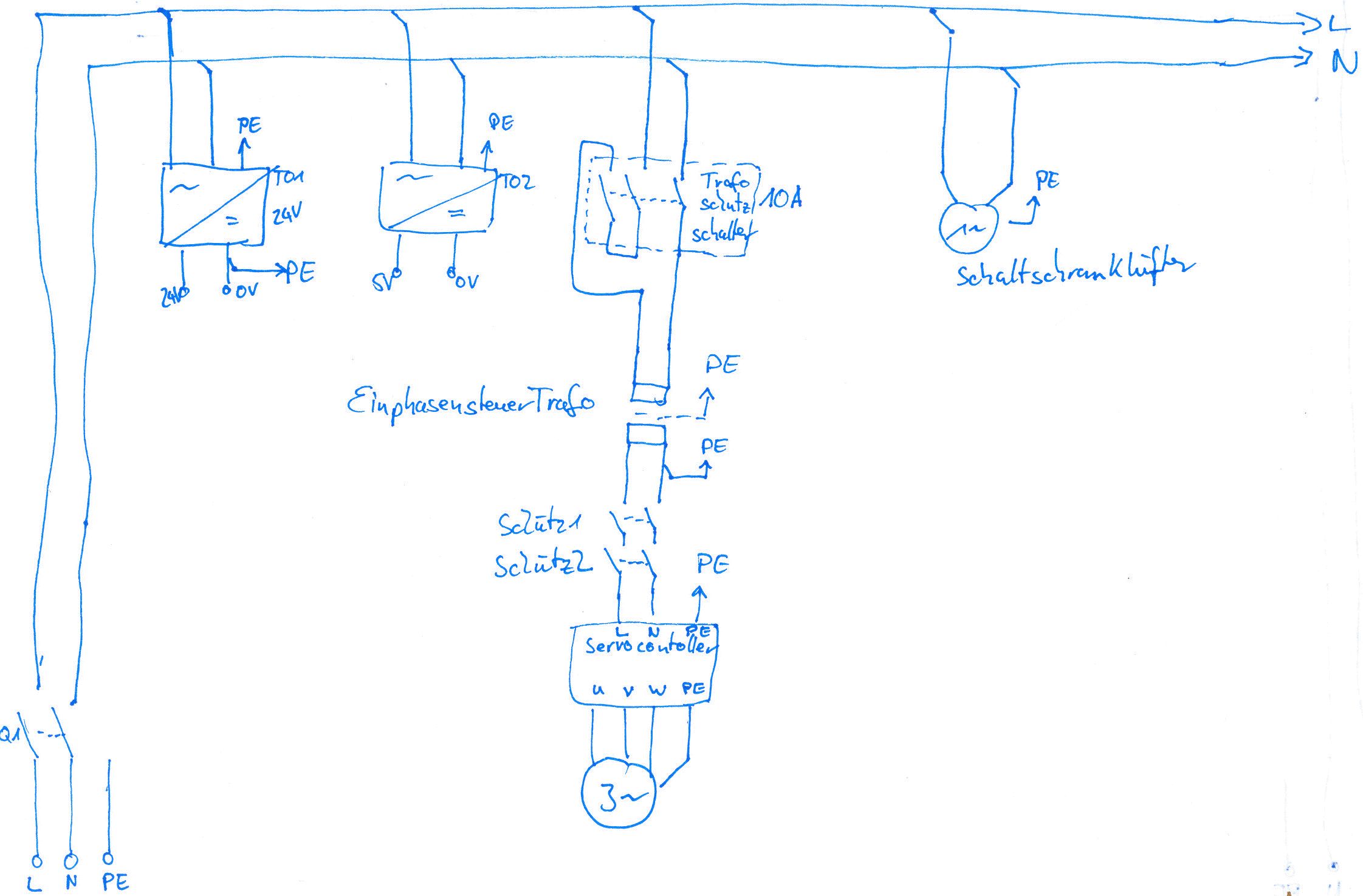 Im Anhang nun die lang geforderte Skizze. nur kurz mit der Hand gezeichnet... sorry. Durch den Schukosteccker habe ich eigentlich keinen definierten L- und N- Leiter. Sicherungsautomaten sind auch irgendwo mit drinne und wenn dann auch zweipolig ausgeführt. Sicherungsautmat ist aber auch nicht erforderlich, da der Leiterquerschnitt mit 1,5 mm² auf die 16 A Sicherung der Stecckdose ausgelegt ist. Die Schütze (1 und 2) werden über einen Sicherheitskreis geschaltet, hab vergessen die Spulen einzuzeichnen. PE ist überall angedeutet geht natürlich auf das PE vom Schuko.