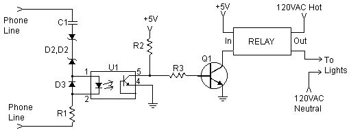 Hallo. Ich hab jetzt eine Schaltung für die Ruferkennung gefunden (sieh oben). Hier die Bauteilliste: 1 x 0.47uF 250V Kondensator (C1) 1 x 10K 1 W Widerstand (R1) 1 x 10K 1/4 W Widerstand (R2) 1 x 1K 1/4W Widerstand (R3) 2 x 20V 1/4W Z-Diode (D1, D2) 1 x 1N4148 Diode (D3) 1 x 2N3904 NPN Transistor (Q1) optional: 2N2222 1 x 4N27 Optokoppler (U1) Diese Schaltung soll genau so in Modems eingesetzt worden sein. Die Z-Dioden lassen nur die hohe Rufspannung durch, so wird nur das Rufsignal erkannt. Muss dann nur noch einen Spannungsregler einbaune um die 12V Steurspannung auf die hier erforderlichen 5V runterzuregeln. Es sei denn ihr konnt mir helfen die Schaltung nach 12V auszulegen. Aber so dürfte die Schaltung ja ohne weiteres funktionieren. Oder? Gruß Matthias