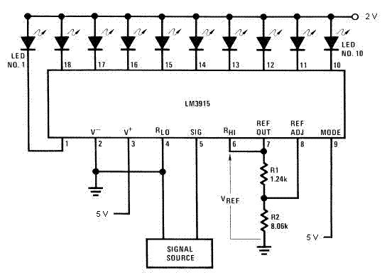 0,7Vpp ist nicht viel, wenn die interne Gleichrichterdiode benutzt wird. Im Datenblatt stehen noch ein paar Vorschläge, wie der Detektor verbessert werden kann. http://www.national.com/ds/LM/LM3915.pdf Die Widerstände um die Referenz herum bestimmen gleichzeitig auch die Helligkeit. Der Eingangspegel für "alle LED an" sollte bei der gezeigten Schaltung gleich der Referenz von 1,2V liegen.