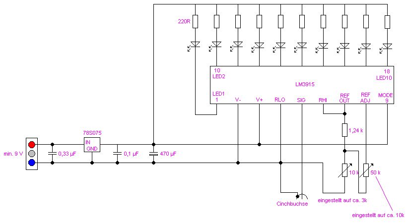 Hallo, danke für die Nachrichten... Doch mehr Fehler als gedacht ;-) Also die Stromquelle ist ein Netzteil von irgendeinem Gerät, das 15 Volt Gleichspannung an den Spannungsregler liefert. Der Elko ist auf der Platine richtig, nur im Schaltplan ist er falsch eingezeichnet. Hab nochmal nachgesehen. Das mit den Potis ist richtig, die stimmen nicht... In dieser Version könnte man drehen wie man will und es würde sich nix ändern ;-))) Ich werds auf alle fälle mal mit einem OP versuchen. Ich hab grade vorher über ein Poti eine Batterie an den Cinch-Eingang gehängt, da gehen die LEDs schön sauber auf und ab, wenn man die Signalspannung mit dem Poti reguliert. Maximalausschlag war etwa bei 6,3 Volt. Also gehts ohne OP nicht so wie das aussieht... Wenn der OP dranhängt, versuchs ich nochmal und werd mich nochmal melden... Vielen Dank Christian