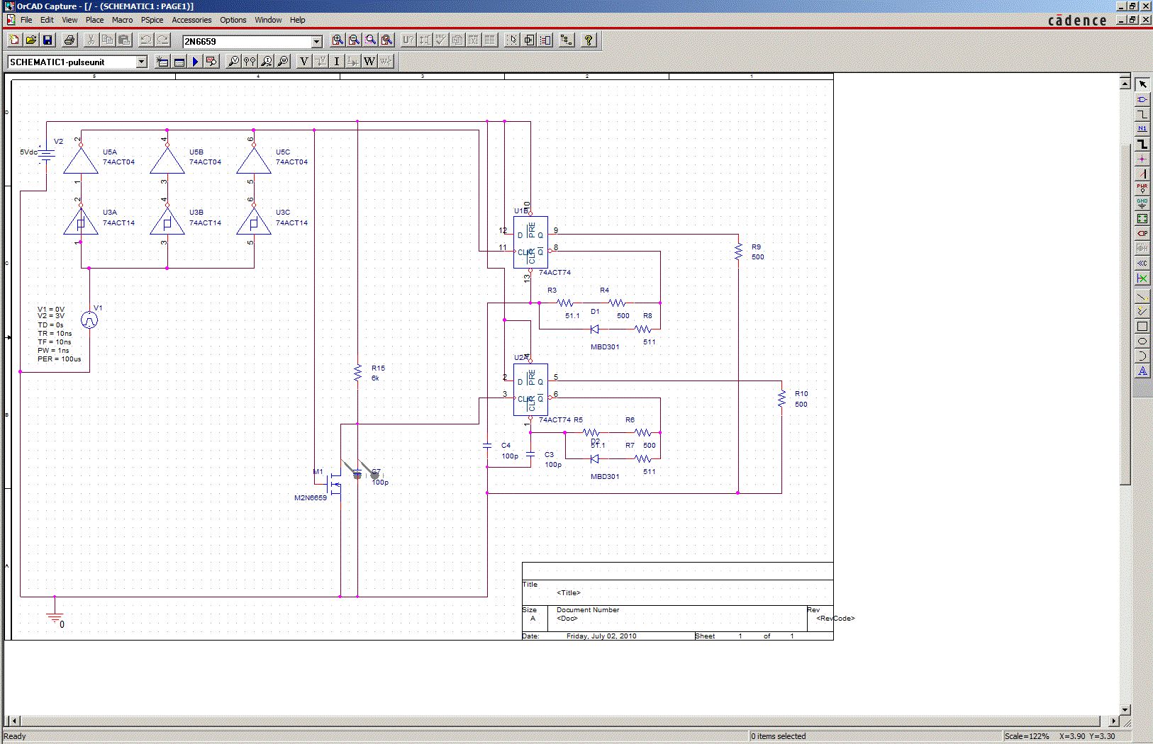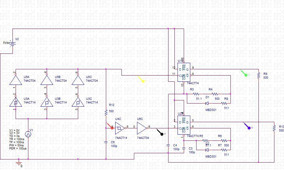 Hallo, ich habe ein clock signal von einem FPGA(bis 10kHz), das ich fuer zwei sehr kuze Impulse nutzen moechte, die dann MOSFETs schalten sollen. Dazu muss ich die Pulsweite der Impulse einstellen koennen. Das tue ich mit R4/C4 bzw R6/C3. Damit komme ich runter bis auf 7ns. Nun sollen die beiden Impulse aber stufenlos einstellbar eine Verschiebung bis auf 1us haben koennen und da komme ich nicht weiter. Mit dem Spannungsteiler R12/C6 erreiche ich lediglich um die 50 ns phase shift. Wenn ich mir die Spannung an R12 von 5V hole und den C6 ueber einen schnellen Transistor kurzschliesse, dann komme ich zwar auf groessere Zeiten, jedoch habe ich dann ein Loch, und es funktioniert auch nicht so richtig. Gibt es da irgent ein Bauteil, was das schon macht oder gibt es da andere Ideen? Gruss Mark