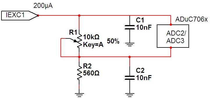 Hallo, Leute! Im Rahmen des studentischen Praxissemesters habe ich bei der Firma ein EVAL-ADuC7060 Board bekommen und soll diesen für weitere Entwicklungen auf "Herz und Nieren" testen. Vor allem ist uns der ADC-Eingang sehr wichtig. Um den ADC zu testen habe ich einen simplen Spannungsteiler mit einem Trimmpotentiometer auf dem Board zusammengelötet (Abb. im Anhang). Der 560Ohm Widerstand dient vor allem für den Offset des Eigangssignals (Datasheet S.6). Für den Test verwende ich den Bespielcode von ADI (auch im Anhang). So, jetzt zu meinem Problem. Wenn ich jetzt die interne Verstärkung (PGA) testen möchte, liefert mir der ADC ab PGA=4 falsche Werte. Ein Beispiel dazu: Bei einer Eingangsspannung von ca. 230mV PGA=1 -> ADC=3206162 //passt PGA=2 -> ADC=6411773 //passt auch soweit PGA=4 -> ADC=7106274 //passt überhaupt nicht Ich verwende folgende Gleichung um Integer-werte in Spannung umzuwandeln