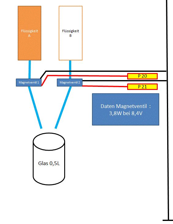 >Bei Ventil habe ich extra die Zeit reingesetzt, da genaues >Timing mit den PC und serieller Übertragung (fast) nicht geht. Ich hatte mir auch sowas gedacht. Also Timer im Controller und dann diesen per PC starten und setzen. Die mischungsverhältnisse ändern dann nur die Zeiten der Timer 1 und 2 . Füllstandsanzeige währ klasse aber wie bewerkstelligen ? Waage ? Auch wollten wir bei den Kanistern sowas einbauen das die anlage nicht leer läuft. Aber wie kann man das machen KAnister werden 2L Wasserkanister http://cgi.ebay.de/Kanister-2-Liter-2-Stuck-1-60-Euro-/270590454609?cmd=ViewItem&pt=DE_Sport_Camping_Outdoor_Camping_Zubeh%C3%B6r&hash=item3f0072ab51 Keine ahnung wie man da den füllstand abfragen kann. Ich habe auch derzeit ein problem bei der auswahl der MAgnetventile, Vorgesteuert Direktgestuert zwangsgesteuert http://cgi.ebay.de/2-fach-Elektro-Magnetventil-3-4-AG-NC-10mm-12V-DC-/200482403740?cmd=ViewItem&pt=Waschmaschinen_Zubeh%C3%B6r&hash=item2eadaeb59c Sowas wollten wir nehmen , kleiner schlauch zu den kanistern -> wenieger durchfluss = besser regelbar mit Timer der große sollt nach außen geführt werden zum glas. Aber reicht ein Vorgesteuertes Ventil ? wenn der Kanister fast leer ist muss das ja trozdem noch sicher abschalten. ich wollte demnächst nach HH zu conrad fahren und Material kaufen. Wollte eine lochraster Platine nehmen und dann muss ich ja sicher Transistoren nehmen zum schützen der ausgänge des Controllers. Gibt es da eventuell einen Tip was man nehmen kann. ruhig besser da die eh nur nen par cent kosten. Oder gibt es fertige platienen mit 10 stück für solche anlässe ? Potenzimeter hab ich das CIP162/220KLIN ( 220k Linear ) gedacht, kostet 1,66€. Das muss ich doch dann ohne zusatzwiderstände anklemmen und nutzen können. Oder bedarf das einer besonderen schaltung ? Danke für die Tips und Hilfe
