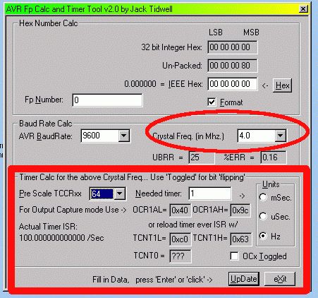Hallo Christian: Es giebt ein TOOL zum brechnen der "Zeitkonstanten", unter der WWW-Adresse http://www.avrfreaks.net/Tools/ToolFiles/292/AvrCalc.zip Siehe Bildanhang. 1.Taktfrequenz eingeben z.B.4MHZ. 2.Zeitkonstante eingeben z.B. 1 Sek. 3.Prescaler des timer1 eingeben,hier 64 Ausgabe für timer1= Tcnt1l= c0 hex Tcnt1h=63 hex