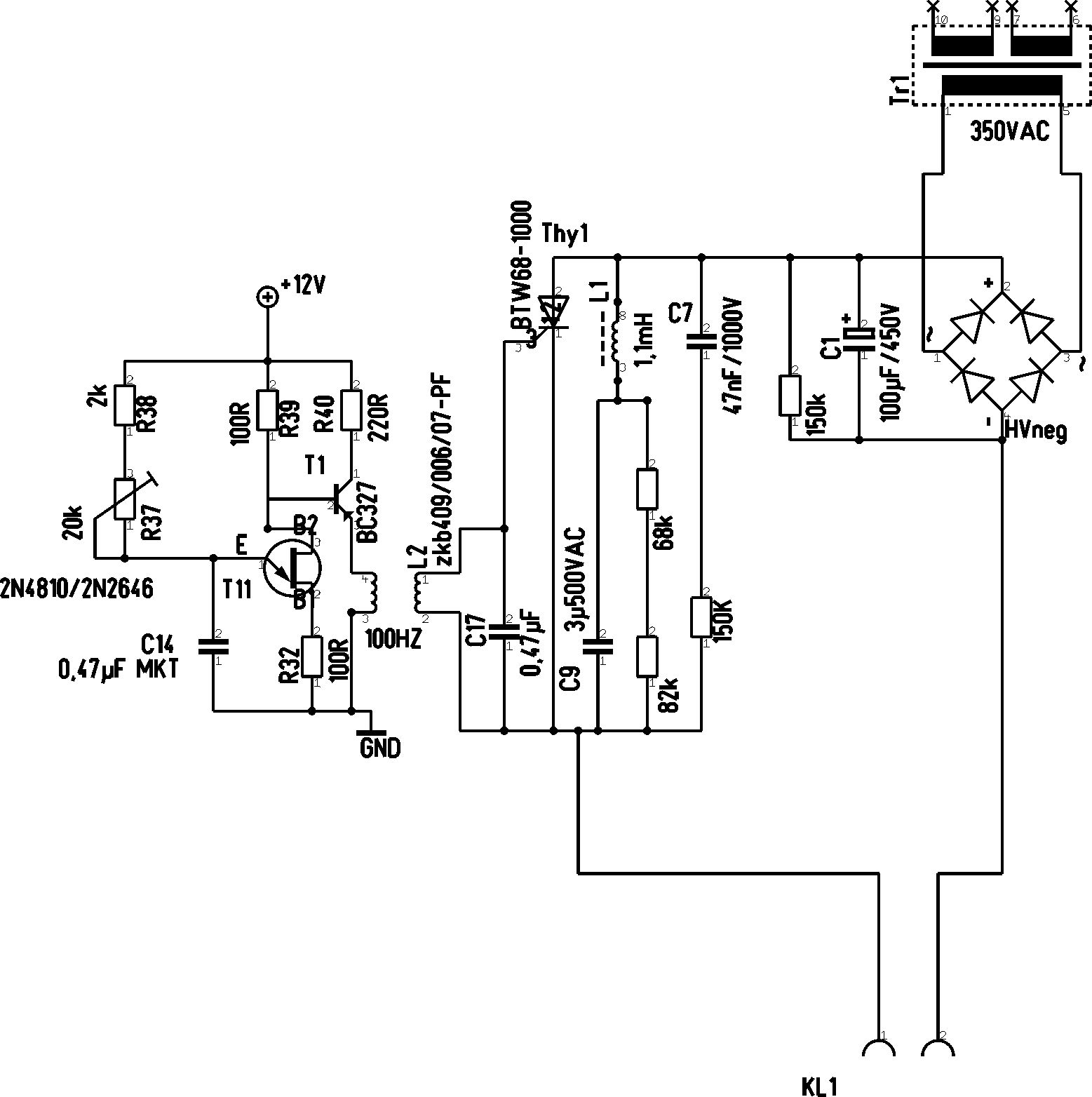 Hallo Lothar, das ist aus einem Elektrofischfanggerät. Das mit dem BC327 ist ein Zeichnungsfehler. Was hat die C9 und L1 Kombination genau für eine Funktion und was würde bei einer Verdoppelung der 3µF auf 6µF zur Folge haben? spielt dann die Induktivität auch eine Rolle bzw. muß angepasst werden? Gruß, Alexs
