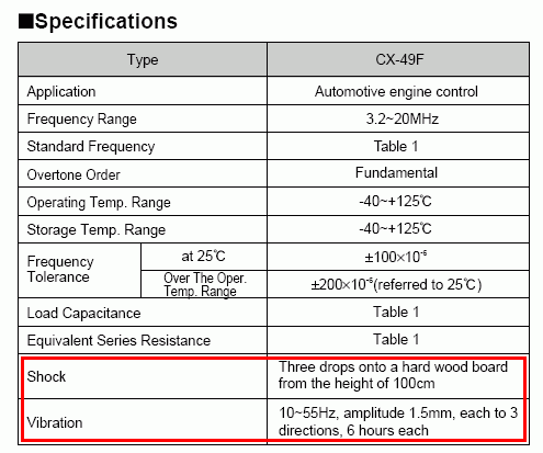 Hallo Thorsten, interessant, hab bisher noch kein Datenblatt gefunden in dem die Angaben drin waren. Sieht doch garnicht schlecht aus. Als empfindlich würde ich das nicht bezeichnen. 0.6g-18g und 6h / Achse. Weißt Du ab das ein Rausch- oder ein Sinus-Test ist? Die Schocks sind auch nicht so gering wie es den Anschein hat. Da eine Platine hochfrequente Stöße filtert, muß man eine komplette Platine schon aus zig-Metern fallen lassen, bis der Quarz eine äquivalente Belastung sieht. Je größer die Platine, desto besser. Ciao, Werner