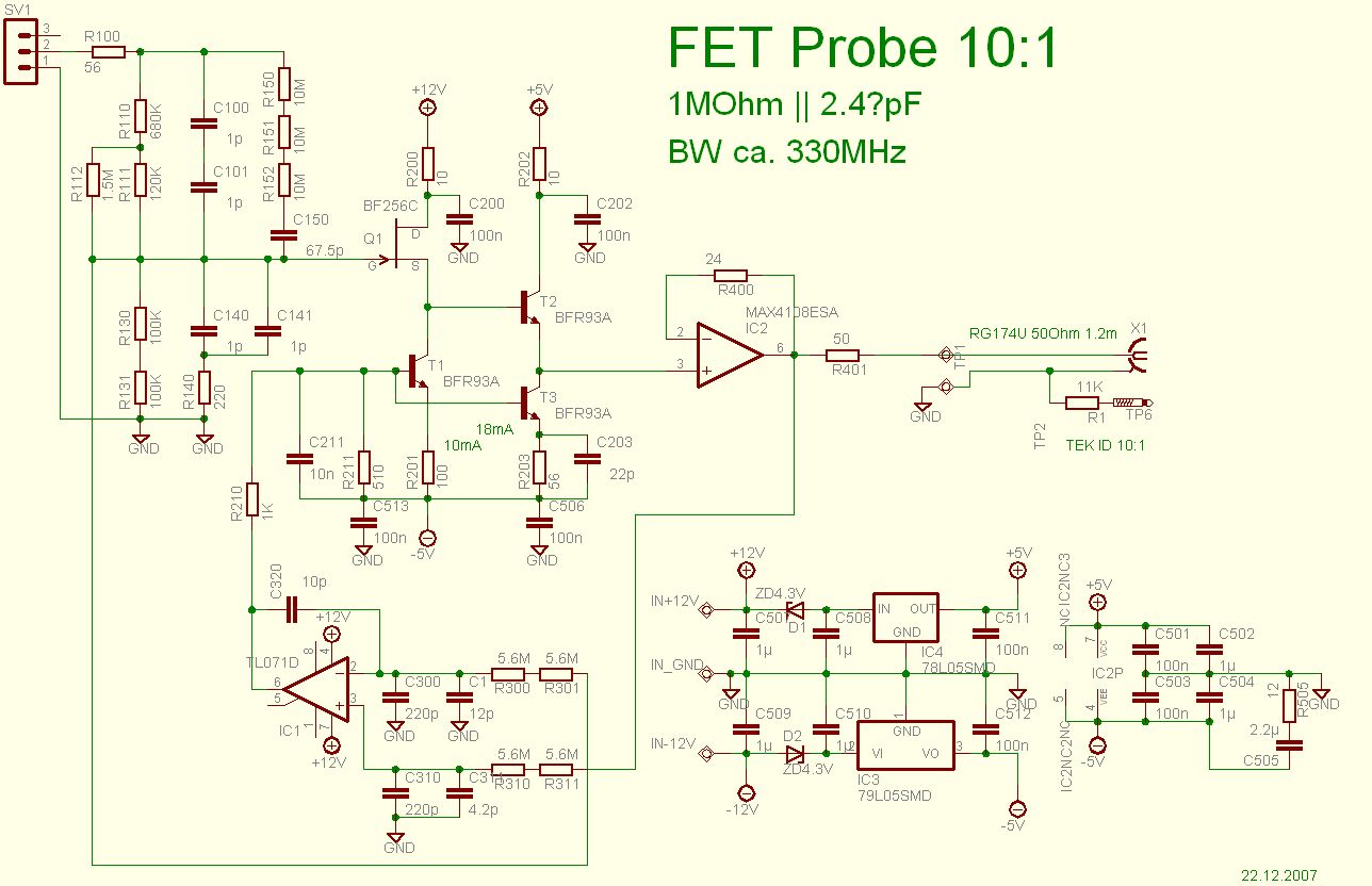 Also das ganze mit den Resistive & FET Probes wurde ja schon x mal in verschiedenen Threads durchgekaut, aber es schein ja immer wieder eine neue Generation nachzuwachsen, die damit so ihre Schwierigkeiten hat. Drum hier nochmal meine Eigenbauten zu diesem Thema - ist wirklich keine Hexerei und gehört eigentlich zur Grundausbildung eines jeden Elektronikers. Wie man am Frequenzgang der Resitive Probe sieht kommt man damit locker über 800MHz - und das für 2.50€ Materialkosten und 2Stunden Arbeit. Der Resonanzeinbruch oberhalb von 1GHz kommt im wesentlichen durch das von mir gewählte Probe Tip Steckersystem. (Die verschiedenen Kurven stellen halbgare Kompensationsversuche dar). Auch eine FET Probe kann man mit einfachen Mitteln selbst machen. Die Version im Anhang schafft ~ 500MHz, was im wesentlichen an dem verwendeten MAX4108 liegt. Aber da die meisten Oszis im Hobbybereich sowieso nur bis 200MHz gehen ist das allemal gut genug. (Die ganze Turnübung vor dem MX4108 kann man sich sparen wenn man gleich einen (etwas schwerer zu beschaffenden) J-FET OpAmp nimmt, war für mich nur eine Übung in Analogdesign) Die beiden Probe Typen sind bei mir in mehreren Varianten seit 3 Jahren im Dauereinsatz und ich kann immer weniger verstehen, was die Leute so an den Passiv Probes finden.