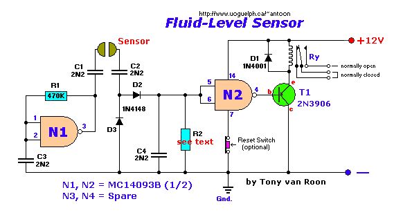 Wieso machste das Poti plötzlich in reihe? Kein Wunder, daß die Schaltung mehr dimmt als schaltet (das Poti soll ja auch als Basis-Ableit-R dienen, um ohne Wasser die Basis auf Masse zu halten. Alternativ kannste auch einen Kerko zw. Basis und Masse schalten, um Brummspannungen (die Deine LED dimmen) wegzufiltern (so 100n - 1µ oder so) Ansonsten - die Schaltung von Dirk J. ist nicht verkehrt. Allerdings finde ich den "Resetschalter" etwas gewagt, denn der schaltet wohl nur einfach ab, wenn dort unterbrochen, und auserdem hängt dessen Eingang einfach auf Masse, während die Uss des 4093 in der Luft hängt - eigentlich ein undefinierter/unerlaubter Zustand, wenn auch nicht als kritisch zu bewerten.