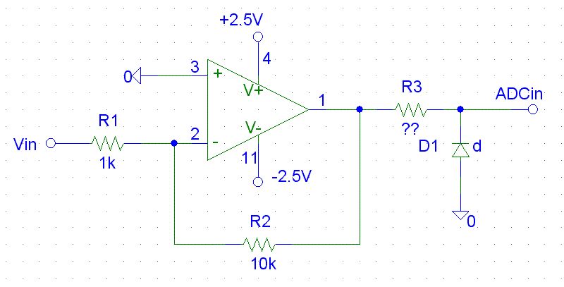 Hallo, ich habe einen inv. Verstaerker der mir Spannungswerte fuer einen ADC des PICs zur Verfuegung stellt. Der Verstaerker wird mit +/-2.5V versorgt und kann also maximal +/-2.5V am Ausgnag bringen... ...gegen negative Spannungswerte Schuetze ich den ADC mit Hilfe einer Schottky Diode, den Strom moechte ich gerne mit einem Widerstand begrenzen...nun meine Frage, welchen Wert nimmt man zur Strombegrenzung ohne dabei das Messergebnis stark zu verfaelschen? ...im PIC Datenblatt finde ich dazu nur "Rin Recommended Impedance of Analog Voltage Source max. 2.5k" ...heisst das, ich kann meinen Strom mit einem 2.5k Widerstand begrenzen? Glaube nicht, da in diesem Fall meine Messung zeigt, dass so gut wie die gesamte Spannnung am Widerstand abfaellt... ...bin ueber Tips sehr dankbar, und gebe diesmal auch brav meinen Schaltplan dazu ;-) ...edit: es handelt sich um einen PIC24F