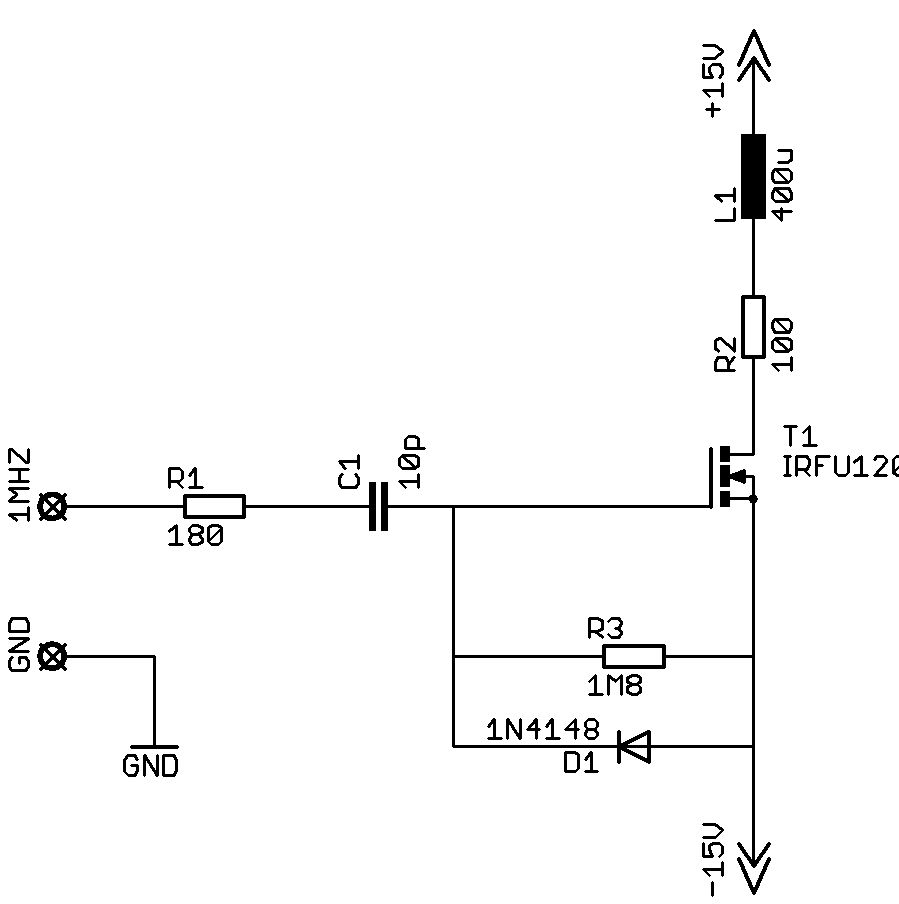 Hallo Chris, du hattest recht, ich hatte die Eigenkapazität nicht beachtet. Den Kondensator habe ich weggelassen und nun bekomme ich wenigstens eine geringe Spannungsüberhöhung. Meine Ansteuerschaltung habe ich auch etwas geändert, siehe Anhang. Mein Problem mit dieser Schaltung ist nun, dass sie zwar schnell schalten kann, mir die Diode aber einen Teil der negativen Halbwelle abschneidet. Da muß ich noch etwas ändern. Hast du da eventuell noch eine gute Idee? Ich habe auch schon einen fertigen Mosfettreiber, den ich auf einer Schrottplatine gefunden habe, ausprobiert (UCC27322), aber irgendwie kam der vermutlich mit den -15 V an Source nicht klar und hat den FET nicht richtig gesperrt. Viele Grüße, Holger