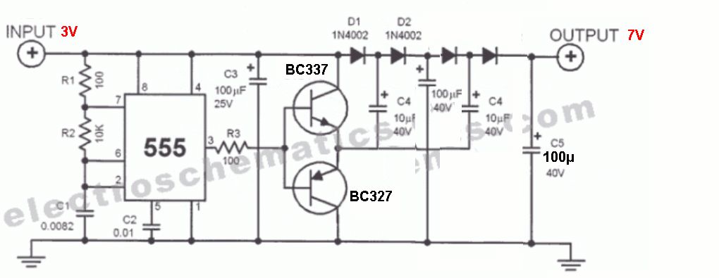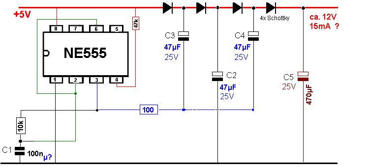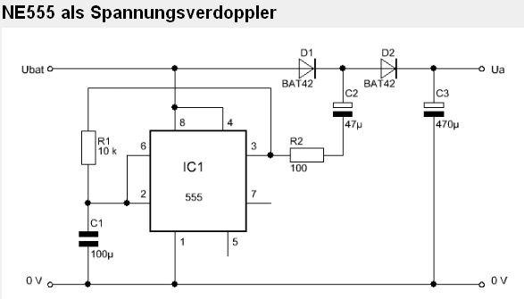 Hi zusammen, erst mal danke schön... Also nehme ich statt 100R nur 10R. Die (47µ) Elkos passen von der Grösse her also. Gut. > Der 100µ soll aber sicher 100n sein. Ich hab jetzt wie der wilde gegoogelt - wo anders sind fast immer 10nF also werden die schon passen. > höhere Frequenz, geringere Stromspitzen, dafür öfters ;- Ja, ist besser :-)) Eine letzte Frage noch: Aber wenn ich einen TLC555 dafür nehme (wäre schön wenn ich von 3V auf 7-8V komme)dann muss ich sicher Transistor dazwischenschalten weil der ja nicht viel Strom liefern kann. Ich hab da einen Plan gefunden und herumkopiert - passt das? (Den R3 würde ich 47R machen) Glg Triti