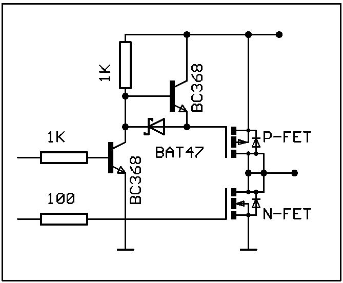 Moin, suche einen diskreten Treiber für den N-MosFet IRF7401. Ich steuer den mit nur 3.3V an. Erstmal nur mit 30kHz, später aber auch gerne höher. Habe aber eine höhere Spannung zur Verfügung. Deshalb wäre es sinnvoll, die auch zu nutzen, um eine höhere Effizienz zu bekommen. Die normalen Totem Pole Schaltungen reichen die niedrige Spannung ja einfach nur weiter. Im Beitrag Beitrag "Re: n-kanal mosfet treiber diskret mit npn und pnp" habe ich die angehängte Schaltung gefunden, die ja ganz gut funktionieren müsste und auch höhere Spannungen an das Gate legt. Hab sie allerdings noch nicht ganz verstanden: 1. Wozu ist die Diode? Um Sättigungen vozubeugen? Müsste dann doch anders herum gepolt sein. Um den zweiten Transistor beim Ausschalten im Strom zu begrenzen, sodass die Basis sofort niedriger ist als der Emitter? 2. Da wäre ich bei der zweiten Frage: Wenn man den zweiten Transitor ausschalten will, fließt doch erstmal ein großer Strom. Es müssten doch zu dem Zeitpunkt beide transistoren durchgeschaltet sein und es gibt einen Kurzschluss. Oder? Ich würde konkret den BC848 mit 5k6 und einer Bat 54 nehmen. Das wäre so OK? Ich hoffe jemand kann meine Fragen beantworten, Arne