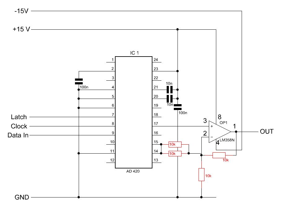 Schließe einen der beiden 10kΩ-Widerstände an Pin 14/15 des AD420 stattdessen an GND an. Gleiches Prinzip wie hier: Beitrag "Re: niedrige Spannungen hochskalieren" Bestimmung der Widerstände: Beitrag "Re: niedrige Spannungen hochskalieren" Die positive Versorgungsspannung musst du auf mindestens +17V anheben, damit der LM358 die +15V am Ausgang schafft.