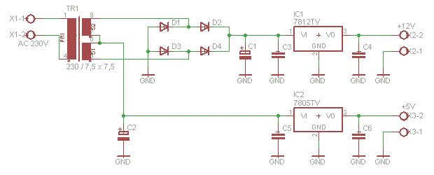 Hallo Gemeinde! Anbei mein Idee als Schaltplan. Der Trafo hat sek. seitig 2 x 7,5 V. Daraus wollte ich einmal eine fixe 12V und einmal eine fixe 5V Versorgung machen. Ich nehme für die 5V eine sek. und für die 12V beide sek. in Serie. Aber geht das überhaupt? Darf ich danach die beiden (-) also GND zusammen hängen? (im Schaltplan rot markiert - die fragliche Verbindung) Ich bin für jeden Tipp dankbar! Viele Grüße, Christian