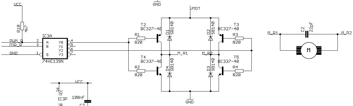 nefuas schrieb: > Wie kann ich aber die ruckartige Umpolung am Motor bzw Relais > kompensieren? > Gar nicht. > Motor stromlos machen ,warten ,umpolen und wieder einschalten . Wie willst du zb das warten mit einfachen Mitteln analog lösen? Ein Relais kennt nun mal nur 2 Zustände: entweder ein oder aus. Was dazwischen gibt es nicht. Wie gsagt: Wenn du das realisieren willst, ist es mit der Einfachheit deiner 2 Endschalter + Relais vorbei. zb so sieht der Motortreiber des NiBobee aus. Dei Steuereingänge sind links. Das Gebilde in der Mitte mit den 4 Transistoren ist die H-Brücke.