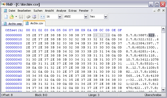 Ich bin dabei mit FreeBasic mein erstes Programm zu schreiben. Dabei soll die EEPROM Aufzeichnung meines µC Projekts in eine Tabellenkalkulations taugliche *.csv Datei umgewandelt werden. Jeder Datensatz besteht aus 7 Byte. 3 Byte stellen das Datum dar, gefolgt von 2 16Bit Werten. Die Konvertierung des Datums funktioniert wunderbar. Der erste 16Bit Wert ist auch richtig als Zeichenkette dargestellt, aber dann beginnen die Fehler. Der zweite Wert sollte 1185 (0h04A1) betragen. In der Archiv.csv steht er aber mit 929. Der Fehler wiederholt sich über die ganze Datei. Nun verstehe ich nicht, warum einige Werte richtig sind und andere nicht. Habe alles nötige gleich mit angehängt. Würde mich sehr freuen wenn sich das mal Jemand anschauen könnte. Vielen Dank im voraus.