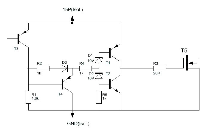 Hi! Oha jetzt hat er Mosfets drinn. Ob das besser ist? Mosfets haben andere Steuerspannungen! Zurück zum alten Plan. Wie das mit den Z-Dioden gemeint war siehst du im Anhang. Meinst du das ist sinnvoll? Was ist, wenn du T4/T5 vertauschst(nichts verdrehen) >Der Sinn einer Vorstufe aus NPN und PNP ist doch er, dass beim >Durchschalten des einen, der andere automatisch sperrt ? Jo, genau darum geht es. > wie soll der NPN (T6) überhaupt schalten können, der hat doch gar kein >Bezugspunkt. So so? Der Emitter hängt also absolut in der Luft? Stelle dir den Mosfet als einen C gegen Masse vor und betrachte den Zeitpunkt t0 wo die Basis von T6 nach 15P schnippt. >Ähm, ich sehe gerade nochwas, der E von T1 hat keinen Bezug zu GND, er >hängt eigentlich nur an der "isolierten Spannung", also in der Luft. Das Problem steht immernoch. Was macht ein Optokoppler? Das sind Grundlagen die du dir selbst erarbeiten musst sonst verstehst du nicht warum es so ist. Viel Erfolg, Uwe