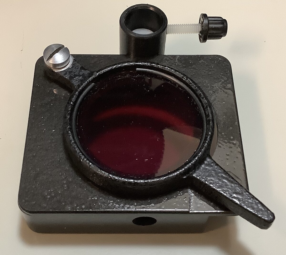 Moin, Falls es Euch ein paar Trivialitäten noch interessieren: Hier sind noch ein paar Bilder von dem neuen Filterhalter. Da der Stutzen des Rotlichthalters wegen der Befestigungsmethode des Filterhalters nicht mehr zugänglich ist, montierte ich den drehbaren teil des Rotlichtsarm auf der Oberseite. Zusätzlich fügte ich eine Nylonschraube zur Arretierung des Halters hinzu. Eine Lackierung verpasste ich dem Halter auch noch. Mechanisch ist die ganze Anordnung jetzt ziemlich stabil und kann sich nicht mehr drehen. Gerhard