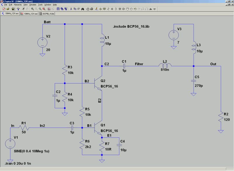 hi, so ich brauch jetzt doch nochmal hilfe bei der schaltung von johannes, ich habe es mal aufgebaut und bekomme eine verstärkung von 2V bei 10Mhz, bei 4 Mhz sind es 6V. ich habe den TP am ende entfernt. ich verstehe leider nicht, trotz des links von karadur, wie die schaltung genau versteht. unten ist es eine normale emiter schaltung, aber wie hängt das mit der oberen zusammen? und warum ist der obere transistor über den basis condensator wechselspannungsmässig auf masse?