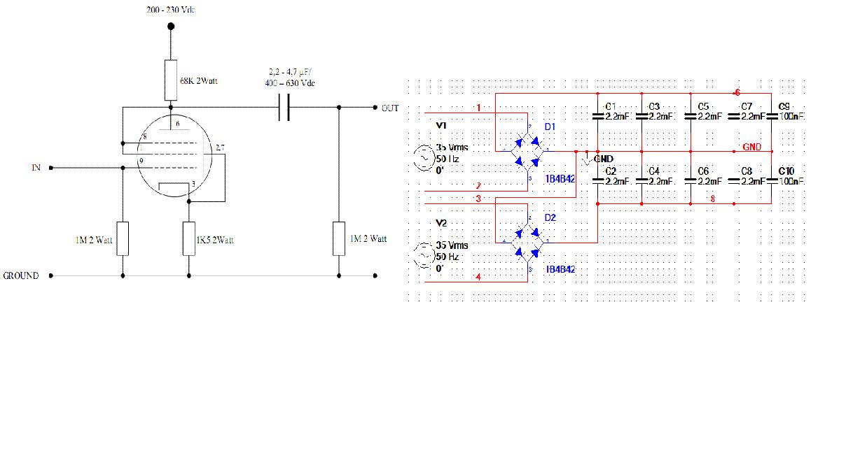 Hallo zusaemmen, Ich habe mir einen Hybridverstärker gebaut. Als endstufe kommt ein LM4780 zum Einsatz und die Vorstufe wird mit einer E80F Röhre betrieben. Nun möchte ich die ganze Kiste so kompakt wie möglich haben und am liebsten nur ein Netzteil benutzen. Für den LM4780 hab ich ein symetrisches Netzteil mit +/- 45 V. Die Röhre ist recht unkompliziert was die Spannung an geht die kann ich mit 45-230 V versorgen die Spannung muss aber unsymetrisch sein. Nun würde ich gern das Symetrische Netzteil auch für die Röhre benutzen. Kann ich da einfach die + und - Spannung anzapfen und masse weglassen ? wie siehts dann mit der Signalmasse für den Eingang der Vorstufe aus ? Gruß Vielen Dank schonmal im Vorraus