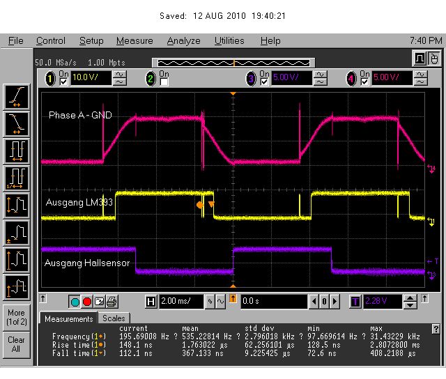 Hi Leute, im Moment befasse ich mich damit, BLDC-Motoren sensorlos anzusteuern. Um das zu testen, habe ich eine H-Brücke sowie einen Mikrocontroller genommen, und eine konventionelle BLDC-Steuerung basierend auf Hallsensoren gemacht. Gleichzeitig habe ich aber nun auch die Schaltung zur Messung der BEMF aufgebaut, so kann ich gut die einzelnen Signale mit den Hallsensor-Signalen vergleichen (später fallen die Hallsensoren dann natürlich weg, und es soll eine Schaltung entwickelt werden, die 3 Eingänge hat zum Messen der BEMF und 3 Ausgänge, welche exakt dieselben Signale liefern wie Hallsensoren). Nun meine Frage. Ihr seht das angehängte Bild. Rosa ist die Spannung der Phase A gegen Masse. Die "schrägen" Flanken sind ja bekanntlich die BEMF-Spannungen. Blau sehr ihr den Ausgang des zugehörigen Hallsensors. Soweit so gut! Nun habe ich einen Komparator mittels LM393 aufgebaut, welcher die halbe Zwischenkreisspannung (in meinem Fall 6 Volt) mit der Spannung an der Phase A vergleicht. Das Ausgangssignal des Komparators seht ihr in Gelb. Frage: ist die Sache soweit schon mal korrekt? Woher kommen die beiden Spikes an der Phase A, welche natürlich auch den Komparator zum Umschalten bewegen? Ist meine folgende Annahme richtig: Um den Motor korrekt zu kommutieren, muss ich nach dem Ausschalten des Highside-FETs der Phase A die Zeit messen, bis der Komparator eine negative Flanke liefert (denn dann ist die BEMF = 1/2 der Zwischenkreisspannung), und dann nochmals so lange warten, und dann den Lowside-FET einschalten. Ist das richtig?